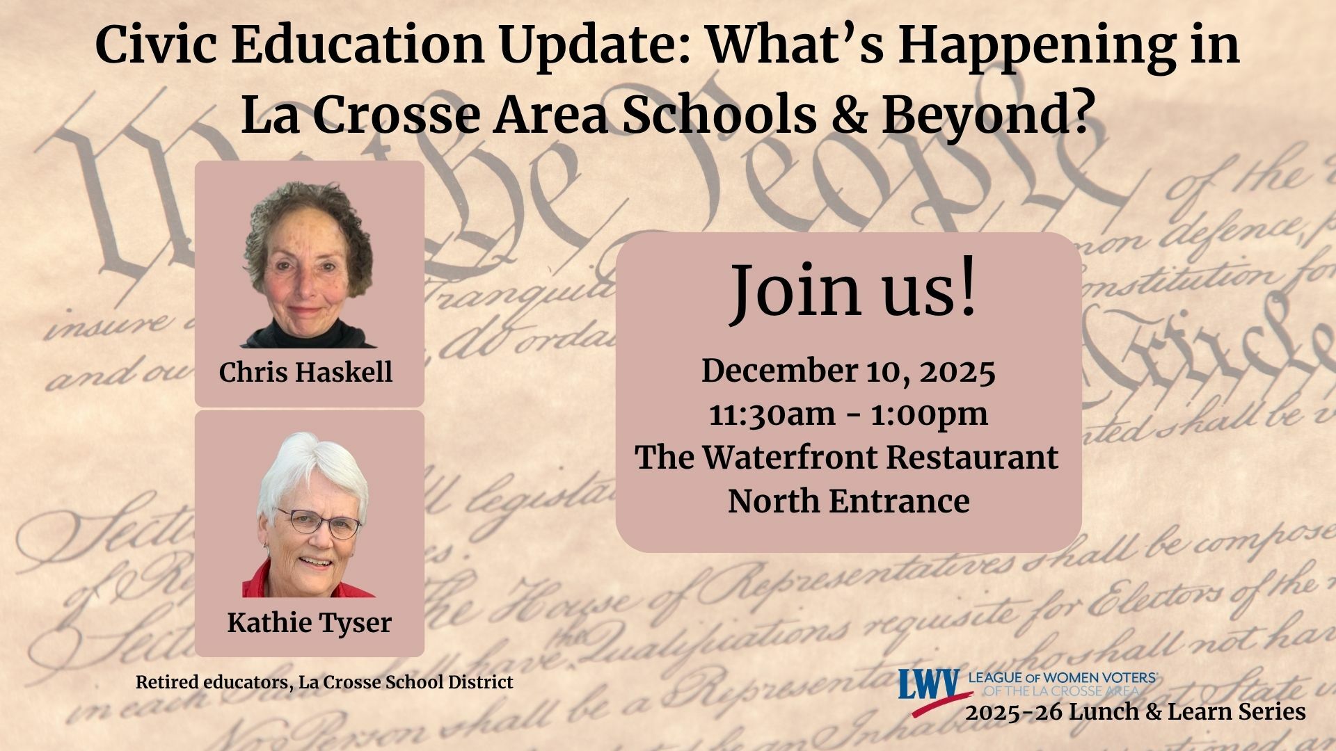 You're invited! Our topic is “Civic Education Update: What’s Happening in La Crosse Area Schools and Beyond.” To reserve lunch, register by end of day Wednesday, Dec. 3rd at lwvlacrosse.org/program. Lunch is $20, or you can attend the program only for free at 12:00 p.m. A recording of the program will be posted on our website soon after the live event. Pre-paid lunches are nonrefundable. If you have any questions, please contact us at lwvlawi@gmail.com.